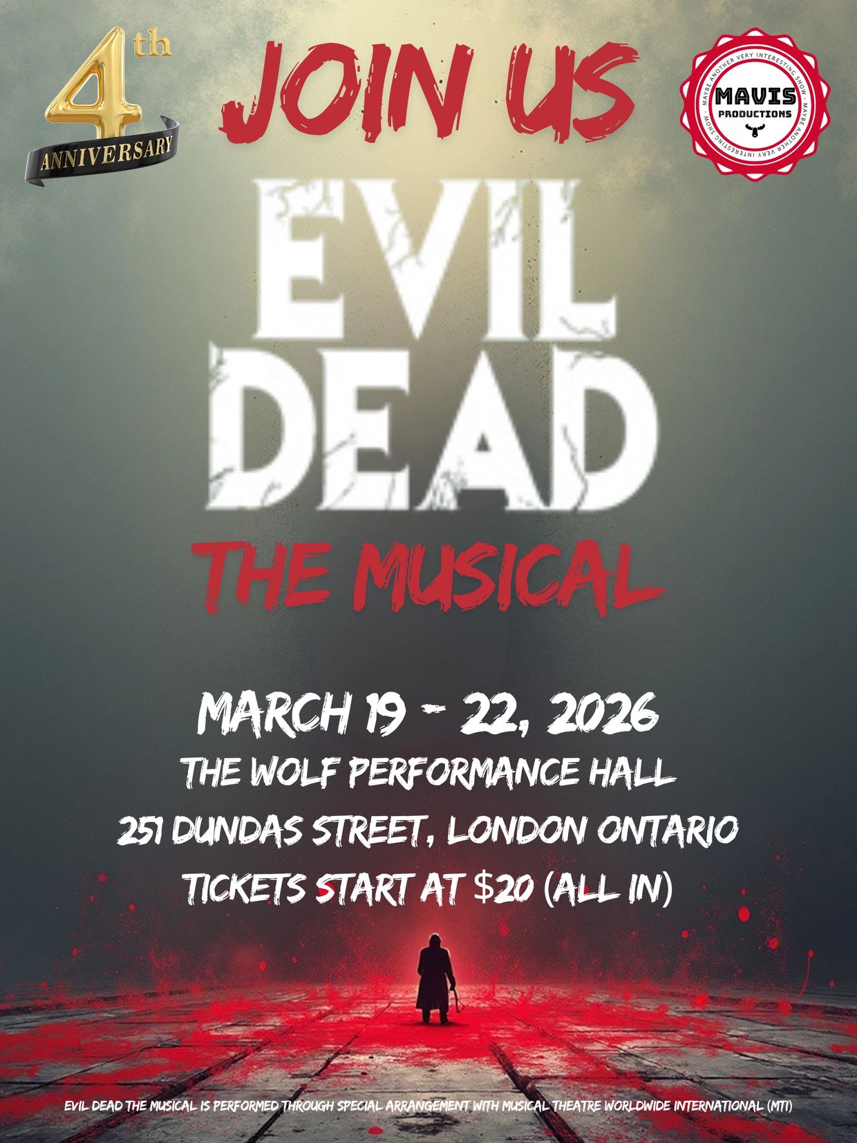 Mavis Productions returns for year 4 of our infamous Evil Dead The Musical!!! That's right, we're back, baby! With an all new production AND an even bigger Splatterzone (You have been warned)!!!